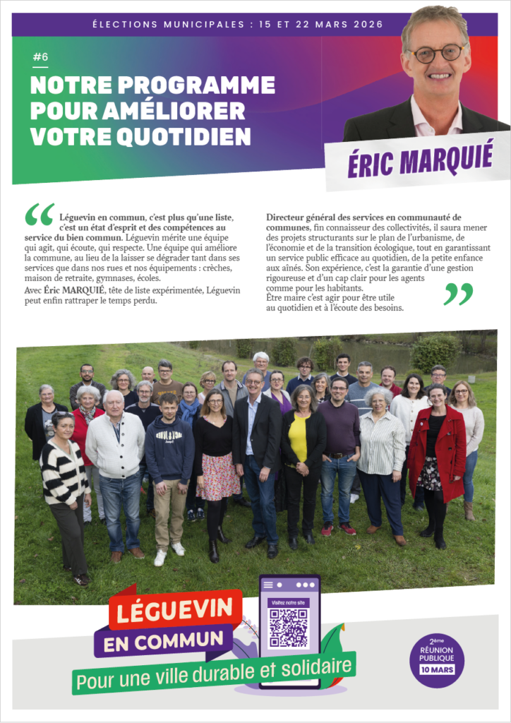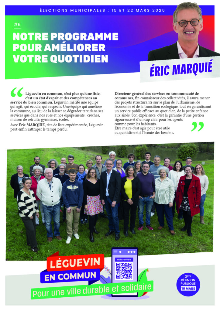 Mardi 10 mars, rejoignez l’équipe Léguevin en Commun et Éric MARQUIÉ à la salle du temps libre dés 20h30.