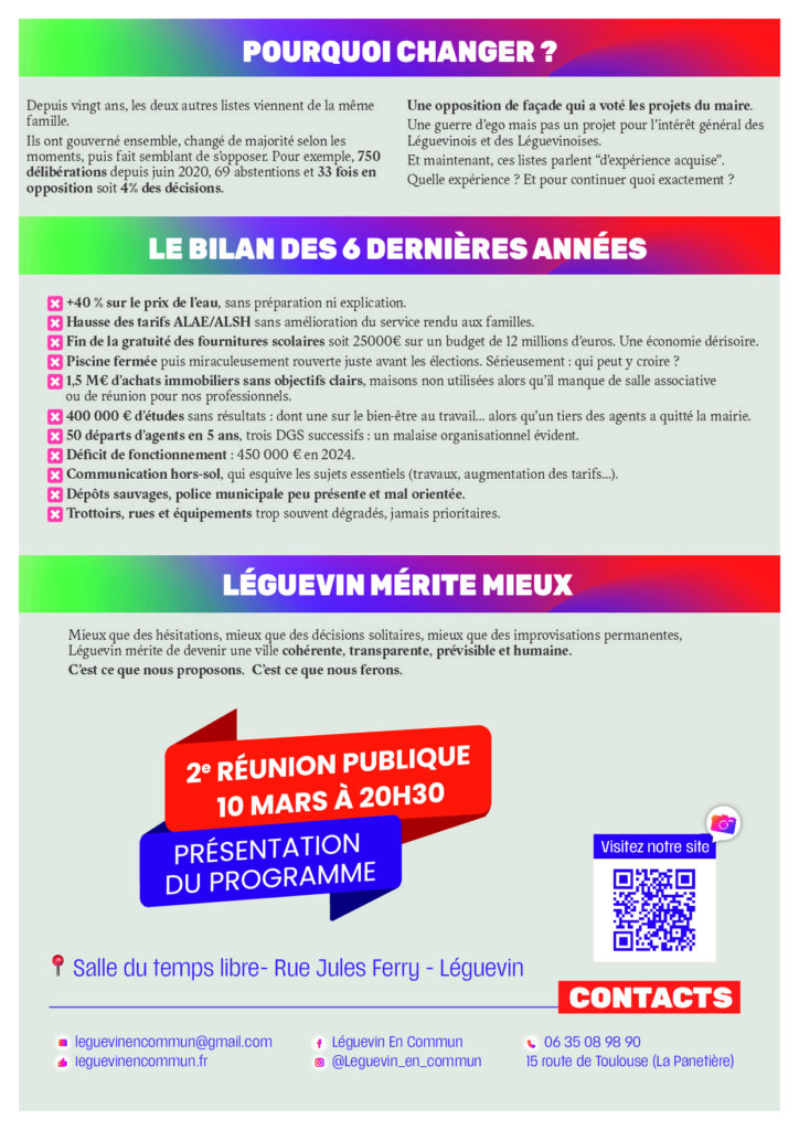 Mardi 24 février, rejoignez l’équipe Léguevin en Commun et Éric MARQUIÉ à notre local de campagne dés 20h30.